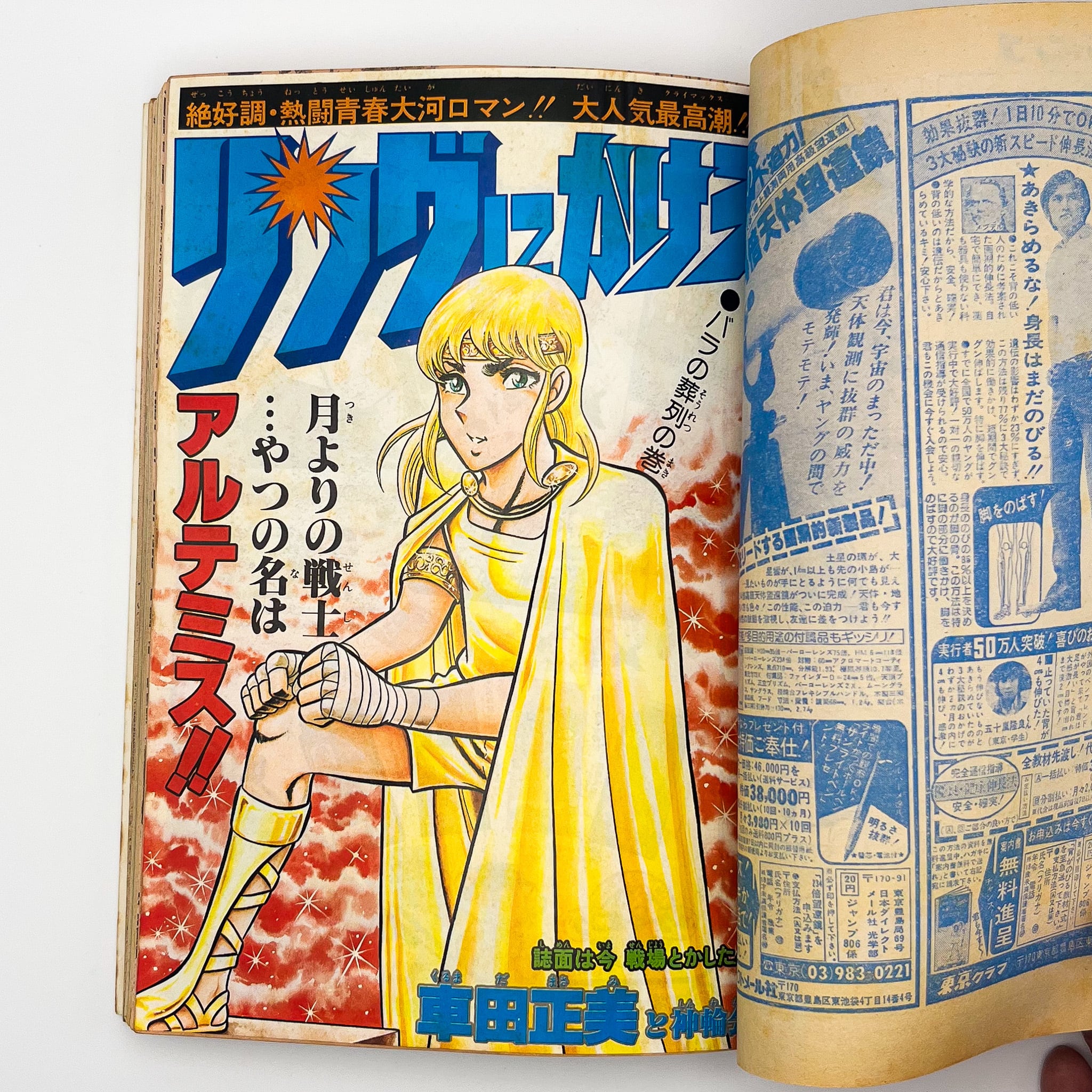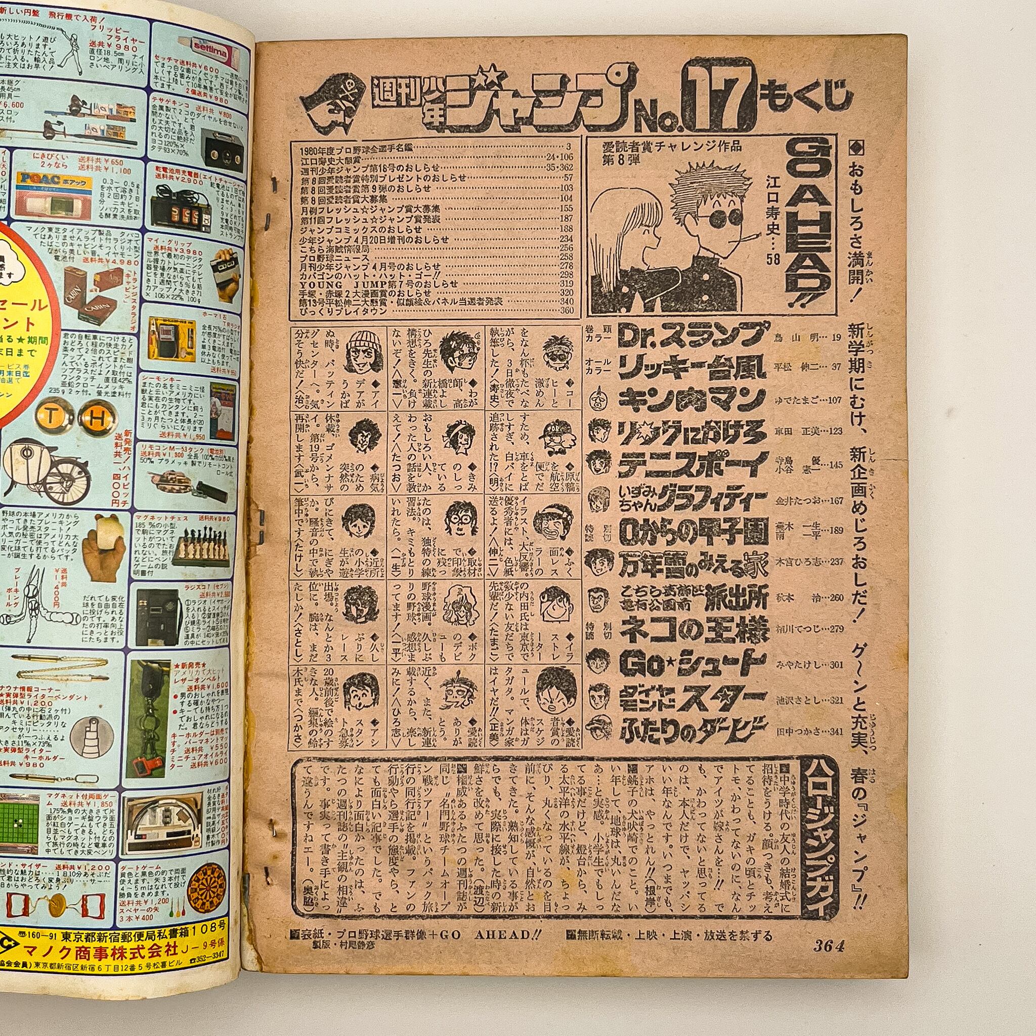 令和の世ではおよそアスリートとは思えない、雄々しいドカベン(香川伸行選手)が表紙の少年ジャンプ。鳥山明「Dr.スランプ アラレちゃん」、江口寿史「GO AHEAD」、車田正美「リングにかけろ」。ゆでたまご「キン肉マン」、平松伸二「リッキー台風」などのちのジャンプの黄金期を予見させる豪華ラインナップ。江口寿史作品の初々しさスゴ。膝の関節をどうこうして云々、などと荒療治すぎる「背をのばす法」など少年誌あるあるの広告も必見です。